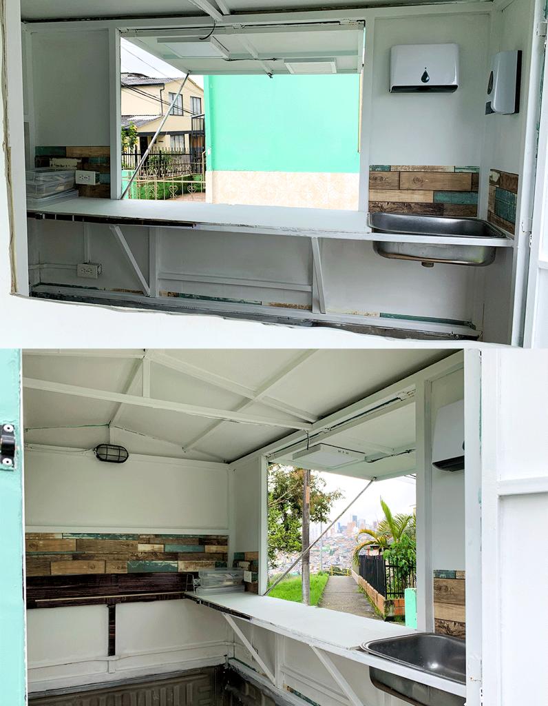 Dos ventanas laterales, conexión y red eléctrica interna con iluminación, lavaplatos con pedal, espacio para cocina de gas y barras para comida.