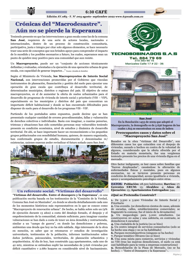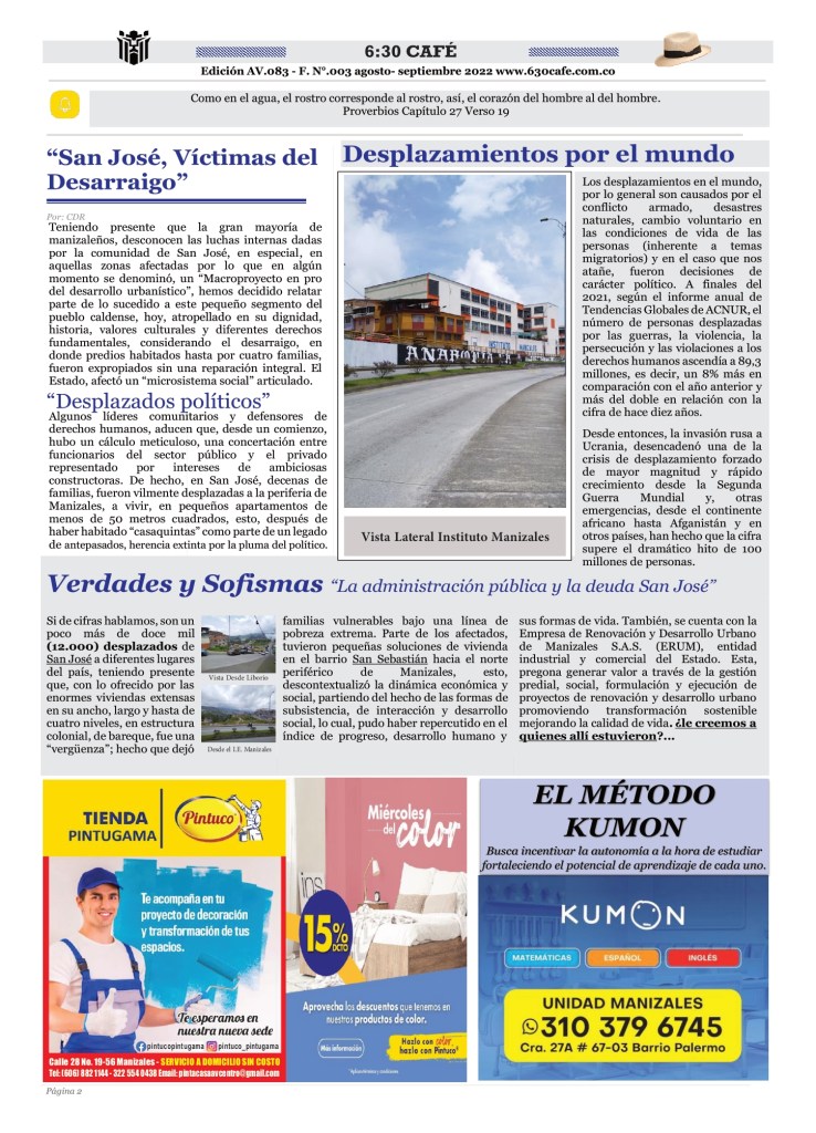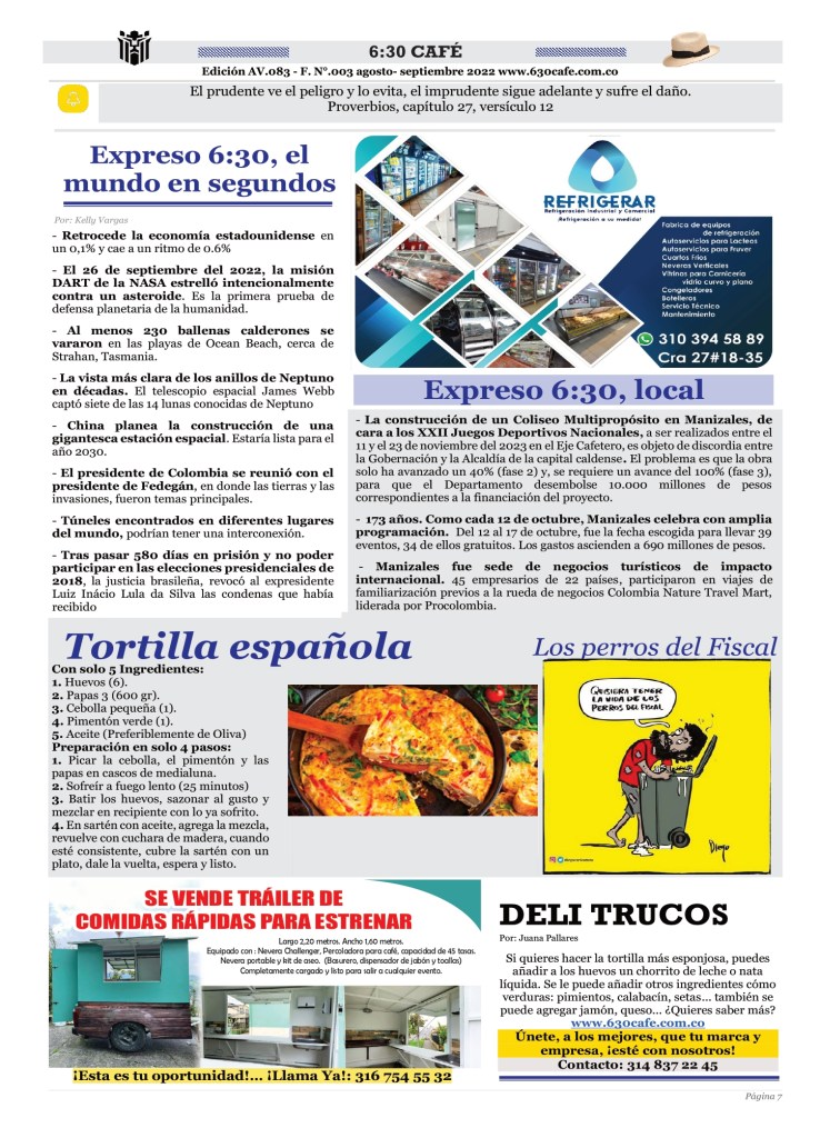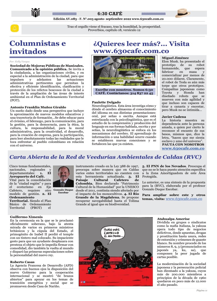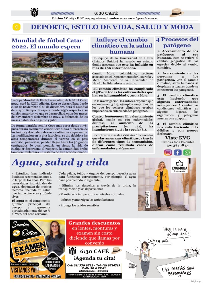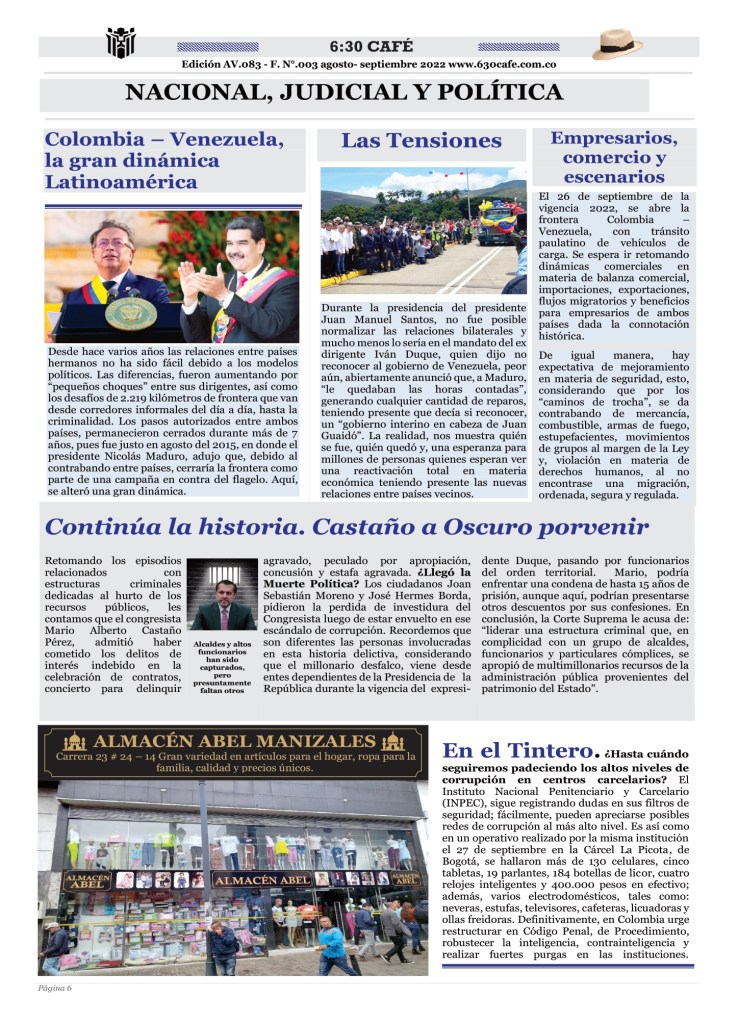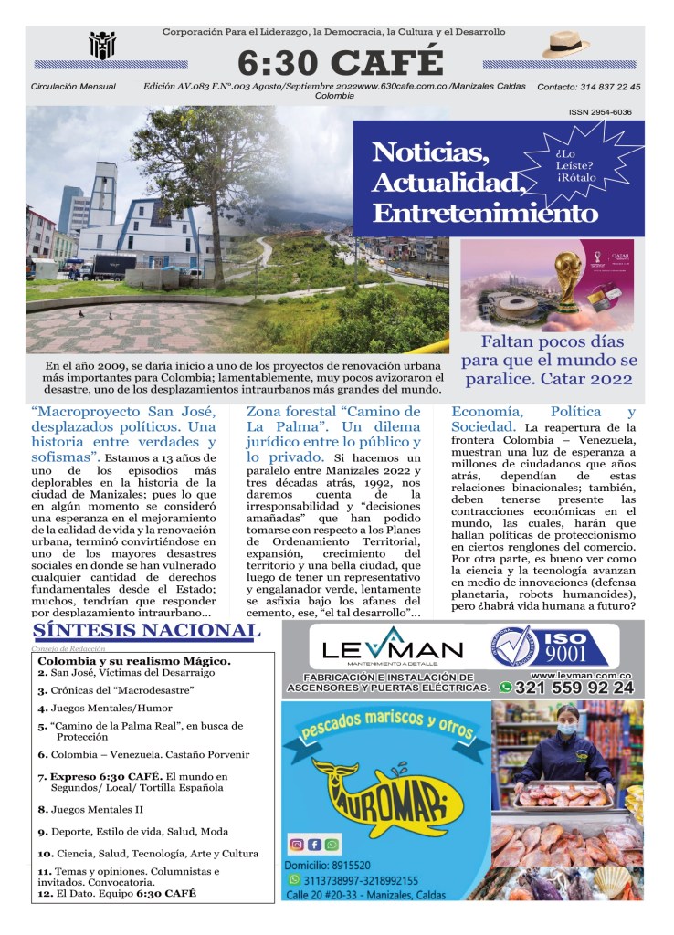AUDIOVISUALES, CULTURA, DEPORTES, ECONOMÍA, EDICIONES, EDUCACIÓN, CIENCIA Y TECNOLOGÍA, ENTRETENIMIENTO, INTERNACIONAL, JUDICIAL, LOCAL, NACIONAL, NUESTRA HISTORIA, OPINIÓN, PLANETA TIERRA, POLÍTICA, SALUD 6:30 CAFÉ Edición Agosto/Septiembre 2022 Fecha: 6 de octubre de 2022Autor/a: 630 CAFÉ 0 Comentarios 6:30 CAFÉ. Agosto/ Septiembre 2022. revista-6-30-cafe-agosto-septiembre-2022Descarga Comparte esto: Haz clic para compartir en WhatsApp (Se abre en una ventana nueva) WhatsApp Haz clic para compartir en Facebook (Se abre en una ventana nueva) Facebook Haz clic para compartir en X (Se abre en una ventana nueva) X Haz clic para enviar un enlace por correo electrónico a un amigo (Se abre en una ventana nueva) Correo electrónico Haz clic para compartir en Telegram (Se abre en una ventana nueva) Telegram Me gusta Cargando... Relacionado