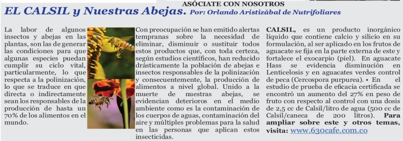 CALSIL es un producto inorgánico líquido que contiene calcio y silicio en su formulación, al ser aplicado en los frutos de aguacate se fija en la parte externa de este y fortalece el exocarpio (piel) evitando la labor de los insectos raspadores, chupadores, comedores de hojas, entre otros y evita la fijación de hongos y bacterias en la piel. Al complementar la aplicación en la zona de plateo del árbol, ayuda a la disposición de nutrientes que pueden encapsularse en el suelo tal como el fósforo, potasio, entre otros y generar una mayor disponibilidad de los mismos por parte de las plantas.