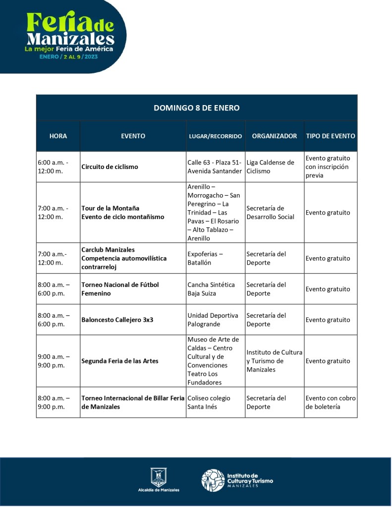 | 6:00 a.m. – 12:00 m. | Circuito de ciclismo | Calle 63 – Plaza 51- Avenida Santander | Liga Caldense de Ciclismo | Evento gratuito con inscripción previa |