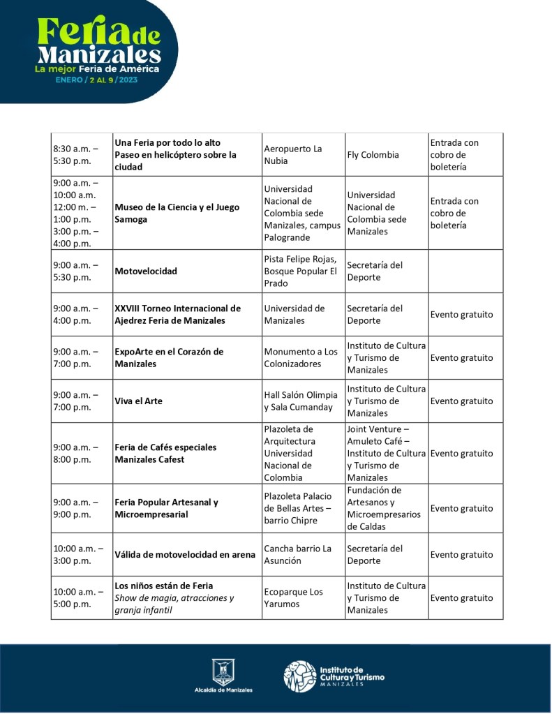 | 9:00 a.m. – 9:00 p.m. | Feria Popular Artesanal y Microempresarial | Plazoleta Palacio de Bellas Artes – barrio Chipre | Fundación de Artesanos y Microempresarios de Caldas | Evento gratuito |