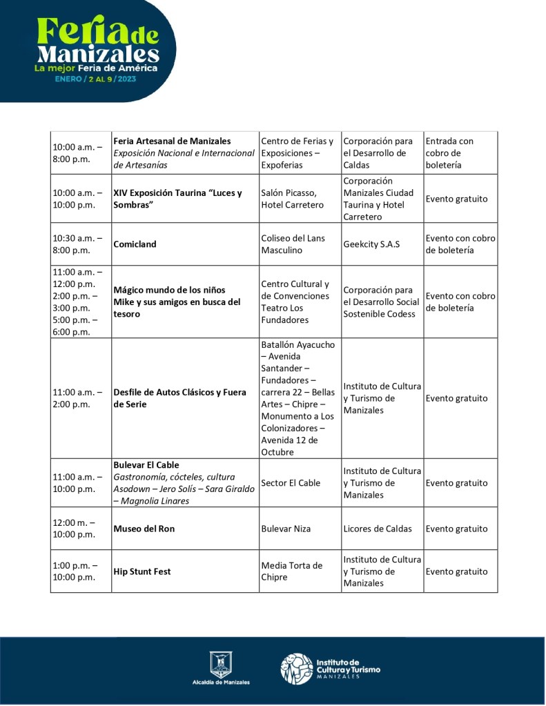 | 11:00 a.m. – 2:00 p.m. | Desfile de Autos Clásicos y Fuera de Serie | Batallón Ayacucho – Avenida Santander – Fundadores – carrera 22 – Bellas Artes – Chipre – Monumento a Los Colonizadores – Avenida 12 de Octubre | Instituto de Cultura y Turismo de Manizales | Evento gratuito |