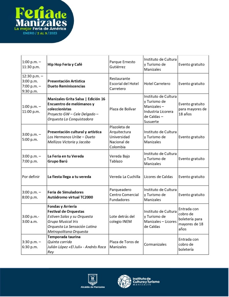 | 1:00 p.m. – 11:30 p.m. | Hip Hop Feria y Café | Parque Ernesto Gutiérrez | Instituto de Cultura y Turismo de Manizales | Evento gratuito |