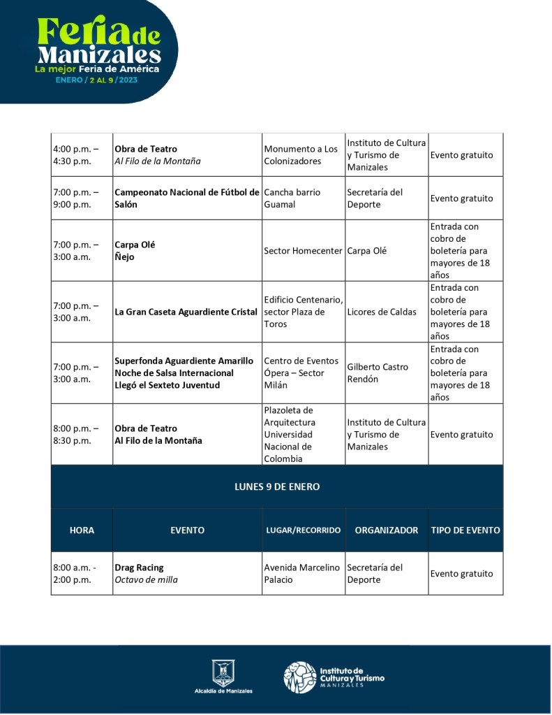 | 4:00 p.m. – 4:30 p.m. | Obra de Teatro Al Filo de la Montaña | Monumento a Los Colonizadores | Instituto de Cultura y Turismo de Manizales | Evento gratuito |