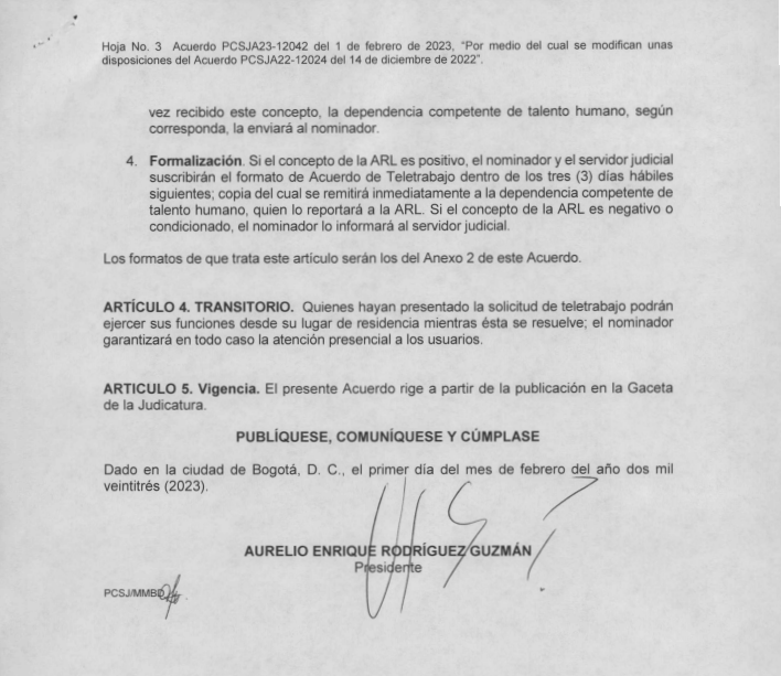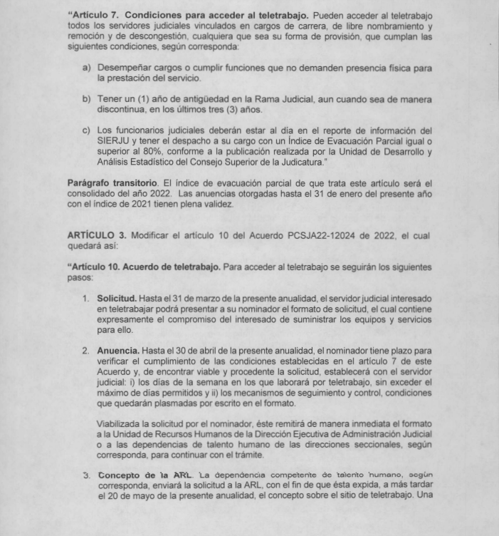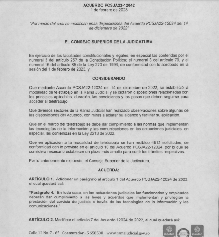 Nota: «El presente artículo fue redactado antes de la modificación a las condiciones dadas para la Rama Judicial, mediante acuerdo del 01 de febrero del 2023, en donde se hace extensivo el tiempo en la modalidad de Teletrabajo para algunos servidores públicos. El documento está firmado por el magistrado Aurelio Enrique Rodríguez Guzmán (Presidente del Consejo Superior de la Judicatura) y se adjunta en el presente».