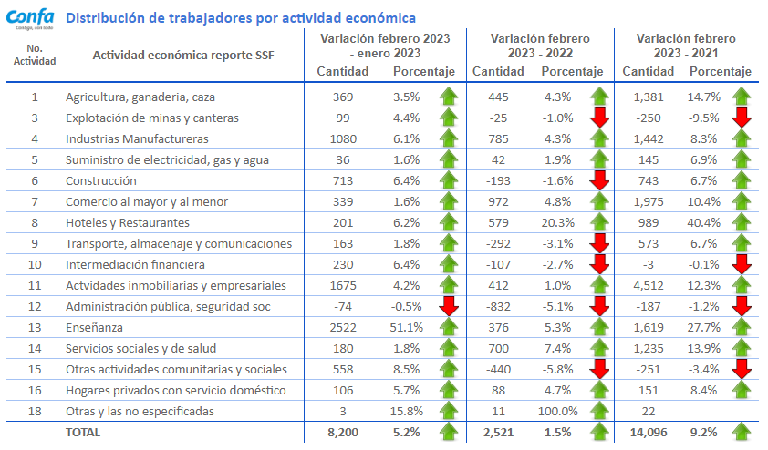 El análisis en sectores económicos en febrero del 2023 comparado con febrero del 2022, decrecen 6 sectores económicos, principalmente otras actividades comunitarias y sociales con -5.8% y crecen 10 sectores económicos, principalmente hoteles y restaurantes con un 20.3%, seguido de los servicios sociales y de salud con 7,4, la enseñanza con 5,3% y el comercio con el 4,8%.