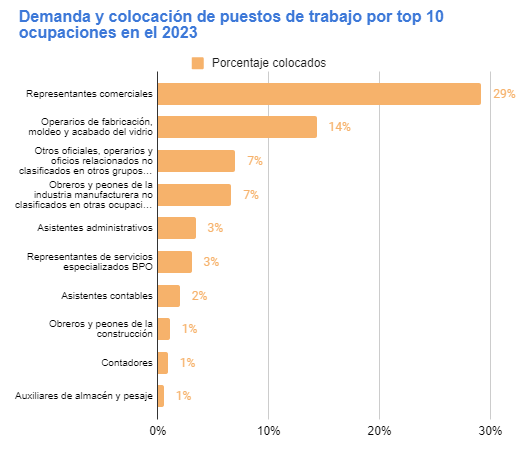 Con respecto a las empresas afiliadas que solicitan apoyo en la gestión de vacantes para cubrir sus puestos de trabajo, puede decirse que el 65% son mIcro y pequeñas empresas, 22% gran empresa y 15% mediana empresa, de la gestión realizada se ha alcanzado una efectividad en la colocación del 73%, lo que evidencia por parte de la Agencia de Empleo una mayor comprensión de las necesidades de los empresarios para la selección del personal idóneo y competente en las empresas de la región.