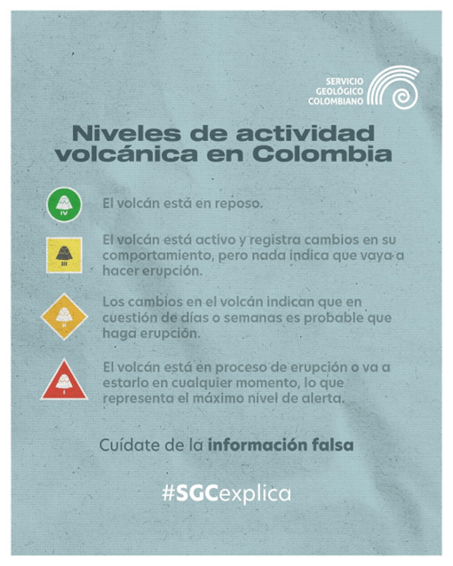 A partir del 30 de marzo en la noche, y debido al incremento considerable de los sismos en este volcán ubicado sobre la coordillera Central en los límites de Tolima y Caldas, desde el Servicio Geológico Colombiano (SGC) cambiamos su nivel de actividad de amarillo a naranja. Les contamos qué significa esto y qué implica. También, hacemos un llamado a la ciudadanía a mantenerse informada a través de los canales oficiales de nuestra entidad.