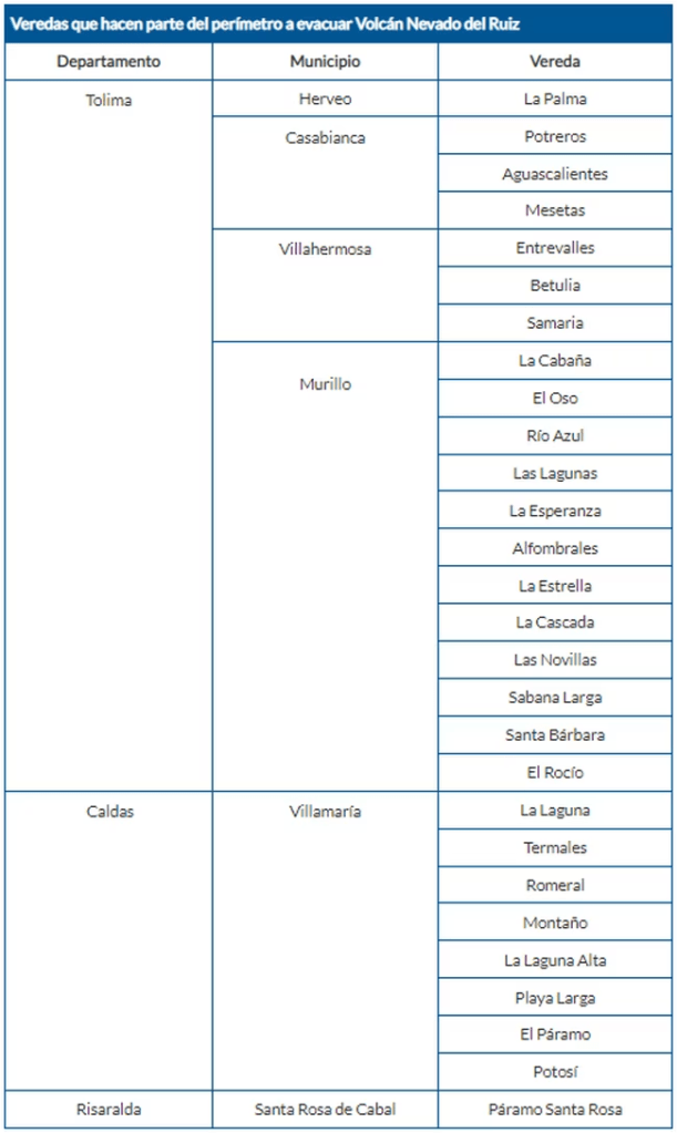 Por ese motivo, la UNGRD verificó con las entidades del SNGRD y las autoridades municipales que algunos sectores de 19 veredas que se encuentran dentro del perímetro y se deben evacuar de manera preventiva, de acuerdo con el mapa aportado por el Servicio Geológico Colombiano (SGC).