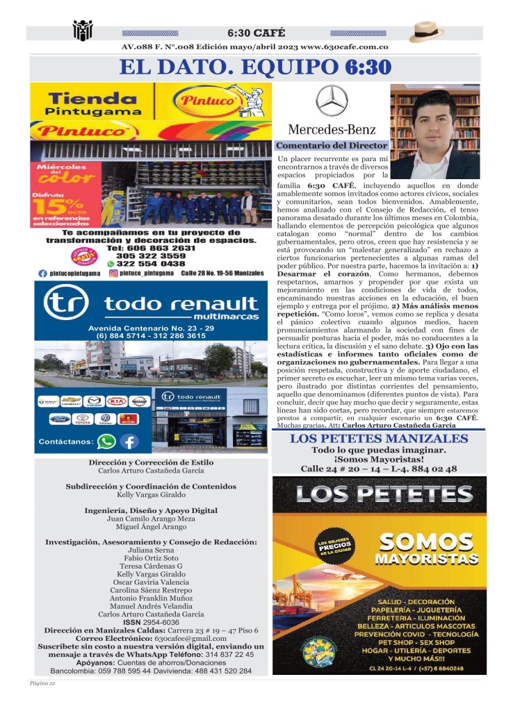 Por nuestra parte, hacemos la invitación a: 1) Desarmar el corazón. Como hermanos, debemos respetarnos, amarnos y propender por que exista un mejoramiento en las condiciones de vida de todos, encaminando nuestras acciones en la educación, el buen ejemplo y entrega por el prójimo. 2) Más análisis menos repetición. “Como loros”, vemos como se replica y desata el pánico colectivo cuando algunos medios, hacen pronunciamientos alarmando la sociedad con fines de persuadir posturas hacia el poder, más no conducentes a la lectura crítica, la discusión y el sano debate. 3) Ojo con las estadísticas e informes tanto oficiales como de organizaciones no gubernamentales. Para llegar a una posición respetada, constructiva y de aporte ciudadano, el primer secreto es escuchar, leer un mismo tema varias veces, pero ilustrado por distintas corrientes del pensamiento, aquello que denominamos (diferentes puntos de vista). Para concluir, decir que hay mucho que decir y seguramente, estas líneas han sido cortas, pero recordar, que siempre estaremos prestos a compartir, en cualquier escenario un 6:30 CAFÉ.