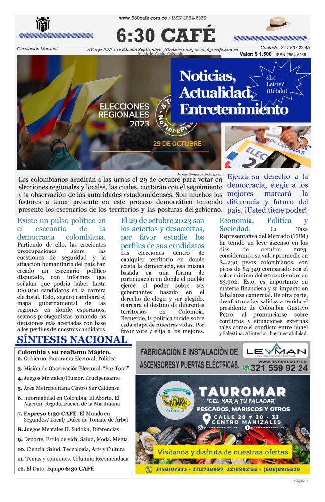 OCTUBRE 6:30 CAFÉ. Edición SEPOCT. 2023. Elecciones 2023. Voto. Democracia. LEVMAN (Fabricación de Ascensores y Puertas Eléctricas), 321 559 92 24. TAUROMAR (Pescados Mariscos y otros), Calle 20 #20 – 33 Manizales, 314 810 73 23 – 311 373 89 97 – 321 899 21 55 – (606) 891 55 20.