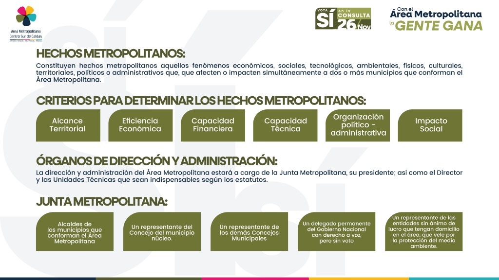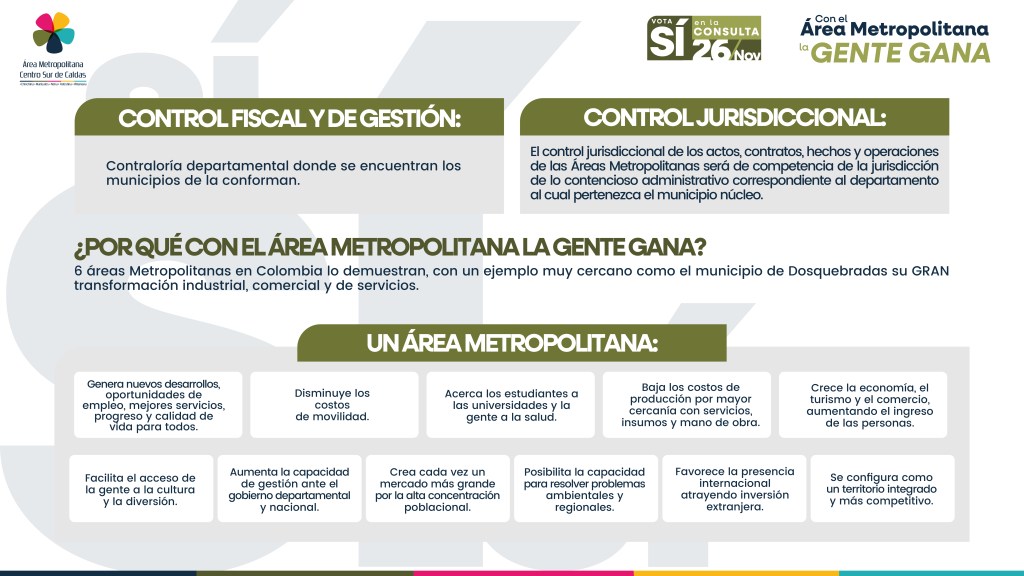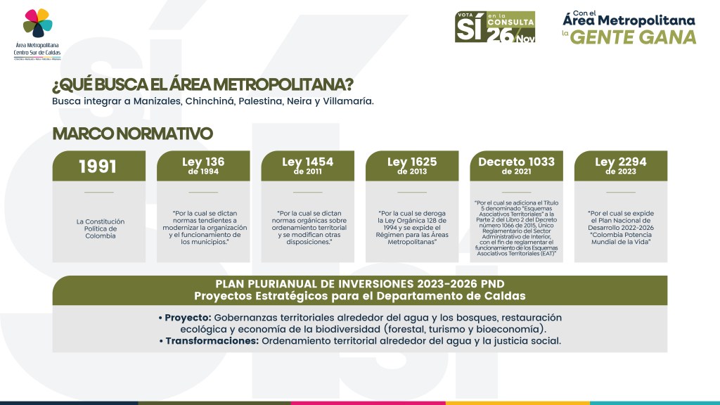 El «Área Metropolitana Centrosur Caldense», busca integrar los municipios de Manizales, Chinchiná,Palestina, Neira y Villamaría basado en instrumentos normativos y legales pero para ello, será vital la participación ciudadana el próximo 26 de de noviembre del 2023.