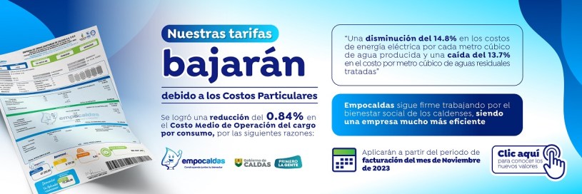 La Empresa de Obras Sanitarias de Caldas EMPOCALDAS S.A E.S.P., se permite informar los costos de referencia a aplicar para la prestación de los Servicios Públicos de Acueducto y Alcantarillado, correspondientes al periodo comprendido entre julio y diciembre del año 2023, debido a variaciones en los costos particulares, que se verán reflejadas a partir de los consumos de noviembre del 2023 de acuerdo con lo establecido en el Parágrafo 4 del Artículo 2.1.2.1.4.2.8 y en el Parágrafo del Artículo 2.1.2.1.4.1.7 de la Resolución CRA 943 de 2021.