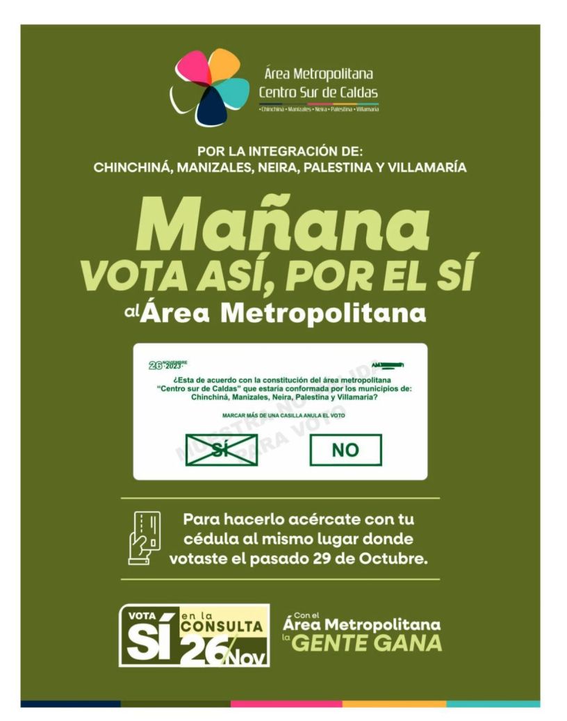 LOCAL, NACIONAL, POLÍTICA Vota SÍ por el Área Metropolitana Fecha: 25 de noviembre de 2023Autor/a: 630 CAFÉ 0 Comentarios Vota SÍ por el Área Metropolitana CentroSur del departamento de Caldas. Palestina, Neira, Chinchiná, Villamaría y Manizales podrán integrarse. Comparte esto: Haz clic para compartir en WhatsApp (Se abre en una ventana nueva) WhatsApp Haz clic para compartir en Facebook (Se abre en una ventana nueva) Facebook Haz clic para compartir en X (Se abre en una ventana nueva) X Haz clic para enviar un enlace por correo electrónico a un amigo (Se abre en una ventana nueva) Correo electrónico Haz clic para compartir en Telegram (Se abre en una ventana nueva) Telegram Me gusta Cargando... Relacionado