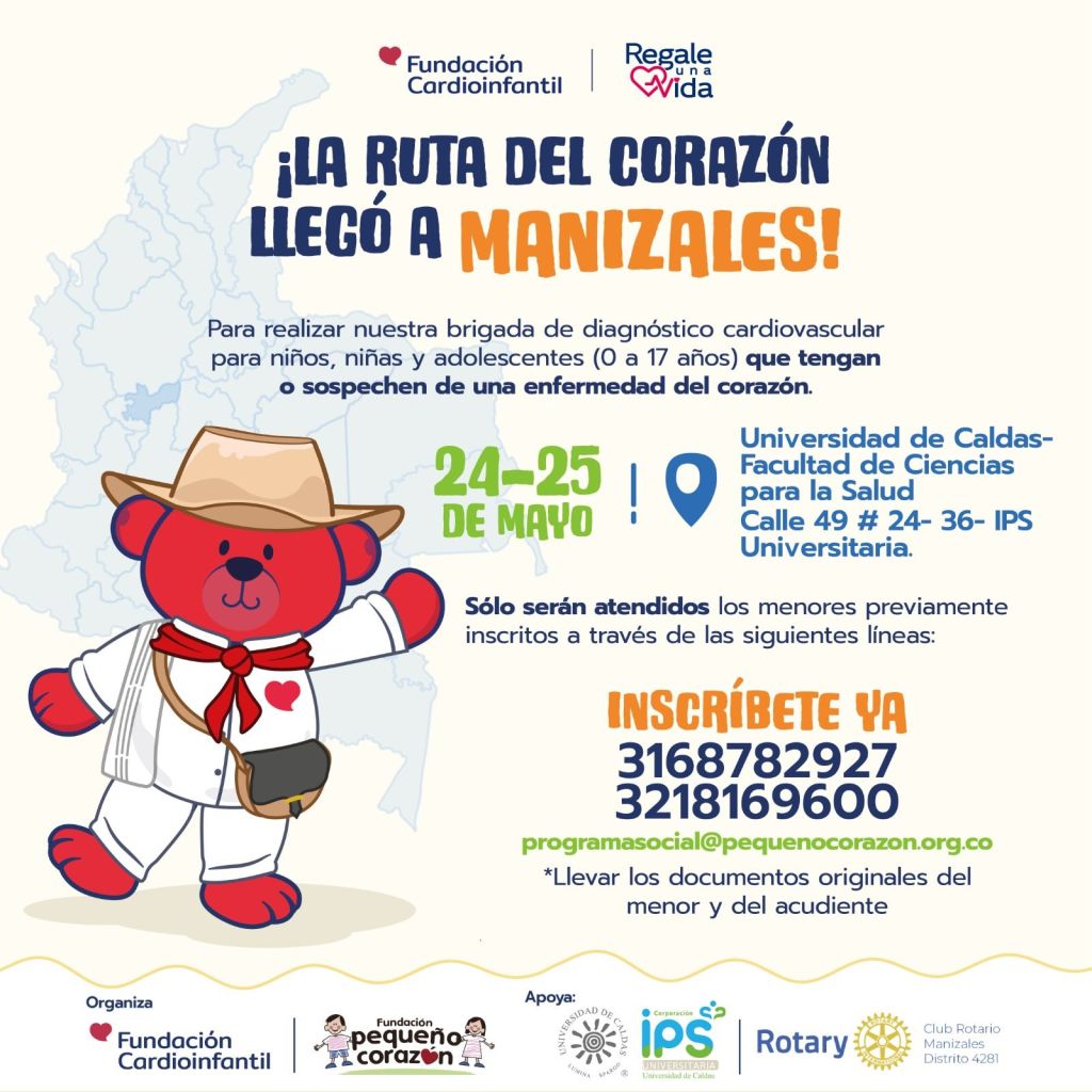 La Fundación Pequeño Corazón, en alianza con la Fundación Cardioinfantil de Bogotá y su programa “Regale una Vida”, invita los días 24 y 25 de mayo, a la Jornada anual de atención en cardiología pediátrica para niños y jóvenes hasta los 17 años de población de estratos 1 y 2, del Eje Cafetero, Tolima, Norte del Valle y otras zonas de influencia.