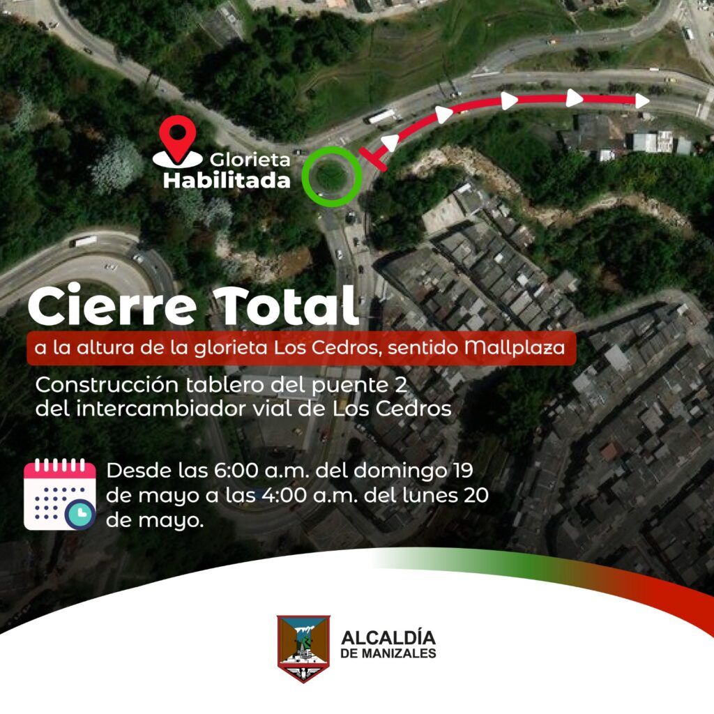El objetivo es continuar con la construcción del puente dos del Intercambiador Vial de Los Cedros. Desde la secretaría de Movilidad de Manizales se recomienda a conductores tomar como ruta alterna el barrio San Jorge. La obra, para su terminación total, tiene prorroga hasta diciembre de este año luego de la adición de 15 mil 600 millones de pesos en los contratos de interventoría y de obra. Con información de la Alcaldía de Manizales
