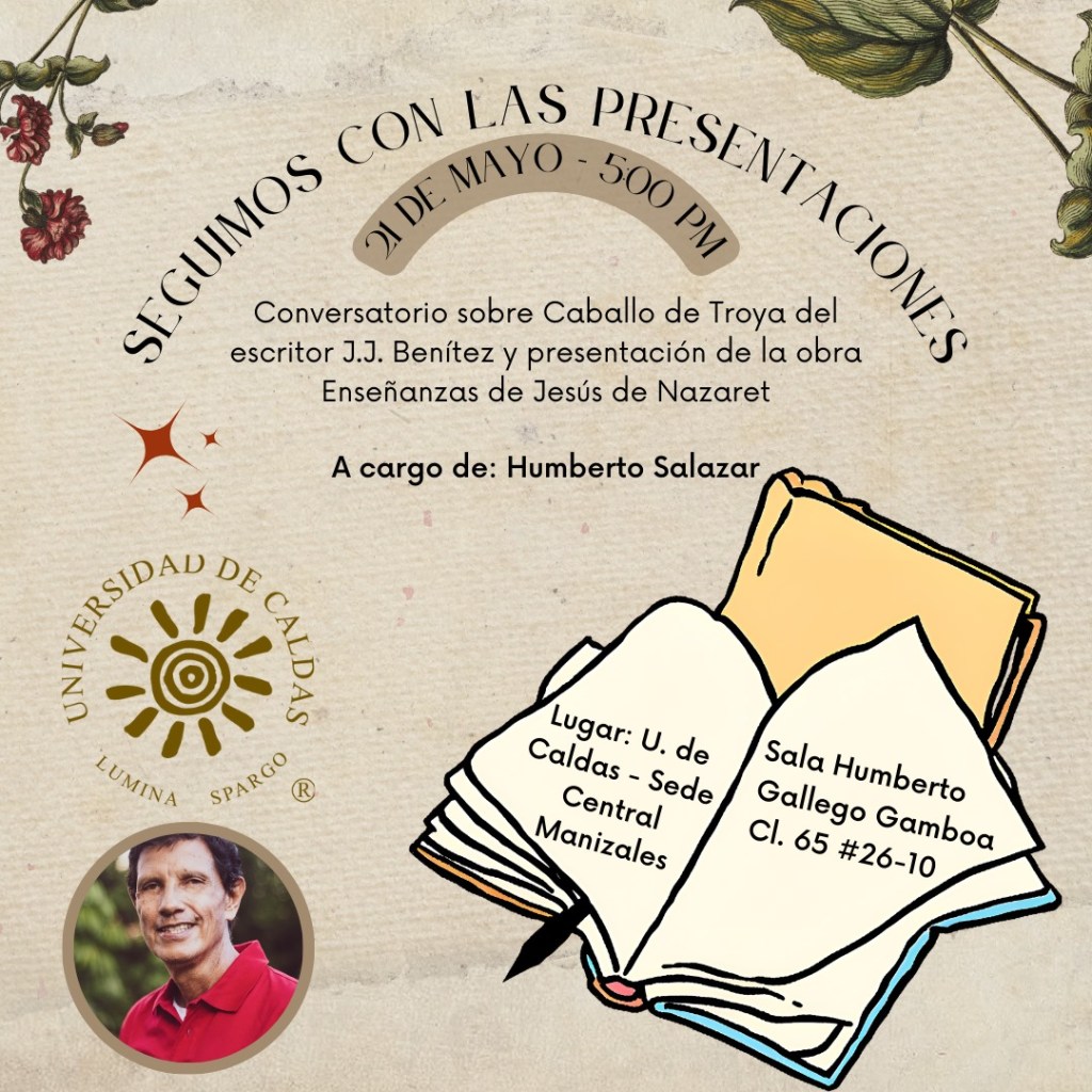 Hoy 21 de mayo 2024 en la Sala Humberto Gallego de la Universidad de Caldas sede Central, ubicada en la calle 65 # 26 – 10, a las 5:00PM, se dará inicio a un conversatorio sobre «El Caballo de Troya» del escritor J.J. Benítez con la presentación del tomo II «Enseñanzas de Jesús de Nazareth», a cargo del escritor y autor Humberto Salazar quién aprovechará para hablar sobre sus obras, escritos y reflexiones. La entrada es abierta al público.