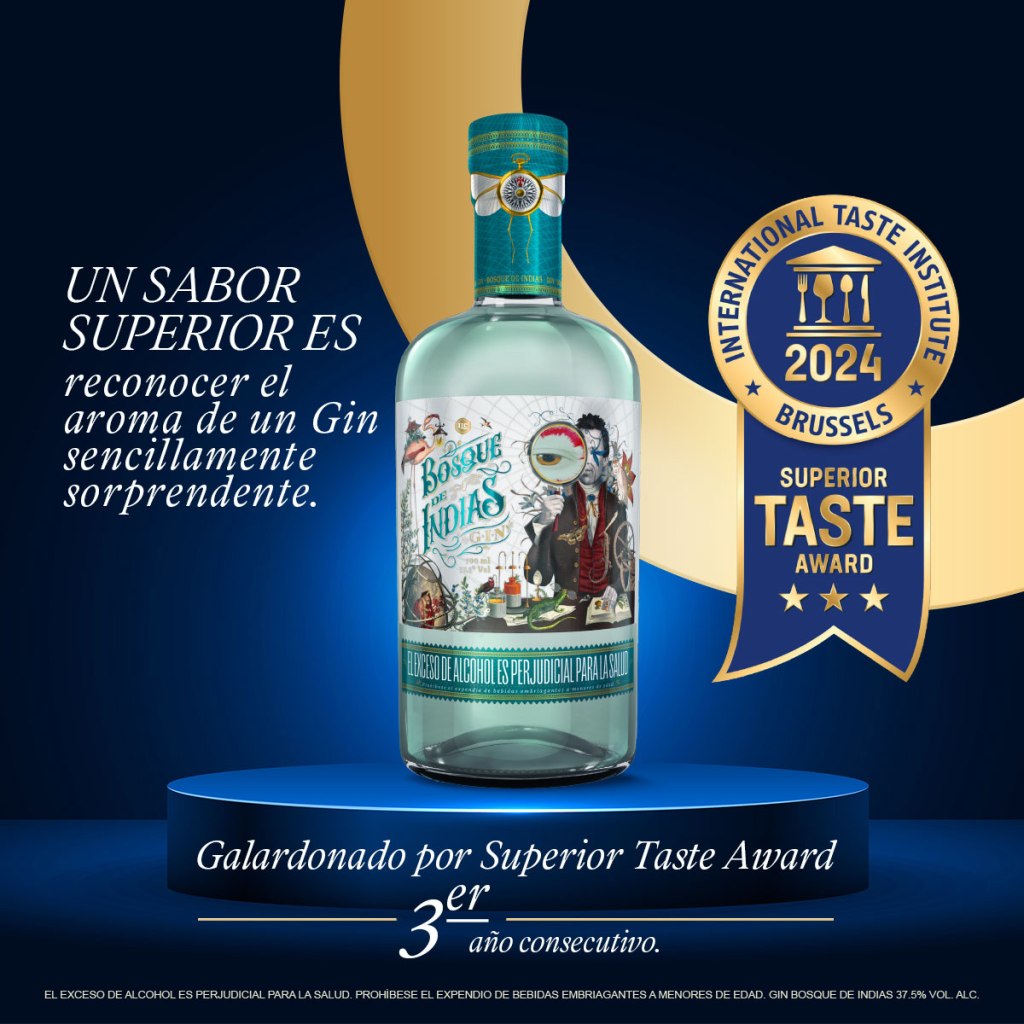 Industria Licorera de Caldas. ILC. Gin Bosque de Indias. Un sabor superior es reconocer el aroma de un Gin sencillamente sorprendente. Galardonado por Superior Taste Award por 3er año consecutivo. «International Taste Institute Brussels. «El exceso de Alcohol es perjudicial para la salud».