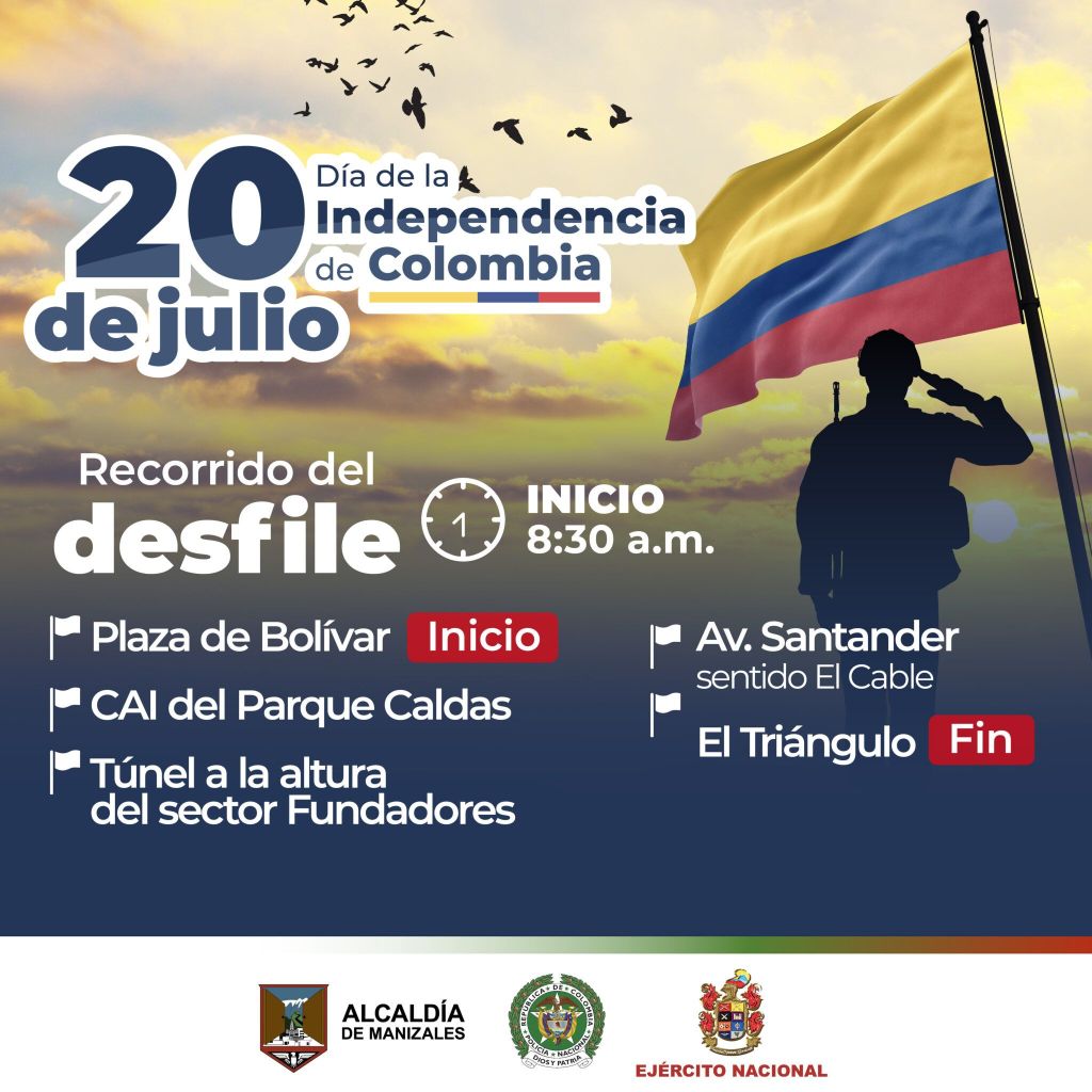 La Gobernación de Caldas, la Alcaldía de Manizales, el Ejército Nacional, la Policía Metropolitana y el INPEC se unen este sábado 20 de julio a la conmemoración del Día de la Independencia de Colombia, con un acto simbólico que comenzará desde las 8:00 a.m. en la Plaza de Bolívar y continuará con el tradicional desfile hasta el sector de El Triángulo.