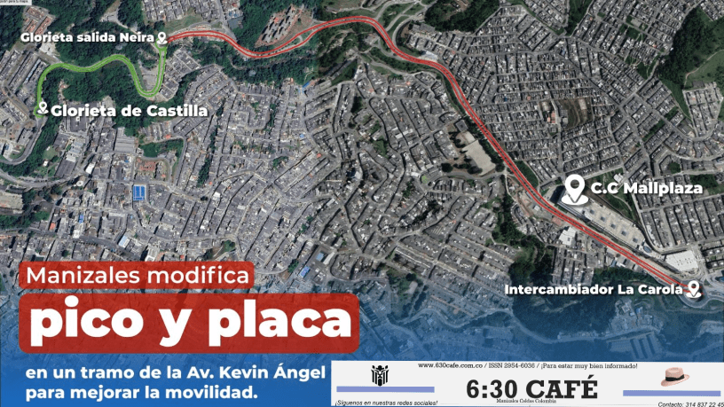 La Secretaría de Movilidad de Manizales anunció una modificación significativa en la medida de pico y placa de la ciudad, a través del decreto 0659 de 2024, que altera el decreto 0179 de 2022; esta nueva disposición levanta la restricción en la Avenida Kevin Ángel, específicamente en el tramo que comprende entre el Intercambiador vial de los Cedros y la Glorieta de Castilla.