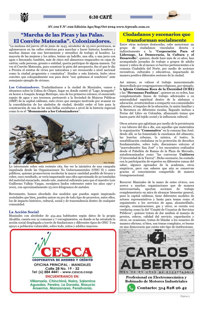Hoy, durante el año 2024, podemos apreciar como nuestra geografía del “centro occidente”, se convierte en uno de los destinos favoritos a nivel del turismo, inversión, industria, educación y hasta residencia. De ahí, nuevos desafíos a nivel de políticas públicas y acciones gubernamentales. No olviden visitar nuestra página web http://www.630cafe.com.co y seguirnos en redes sociales Att: Carlos Arturo Castañeda García Director6:30 CAFÉ