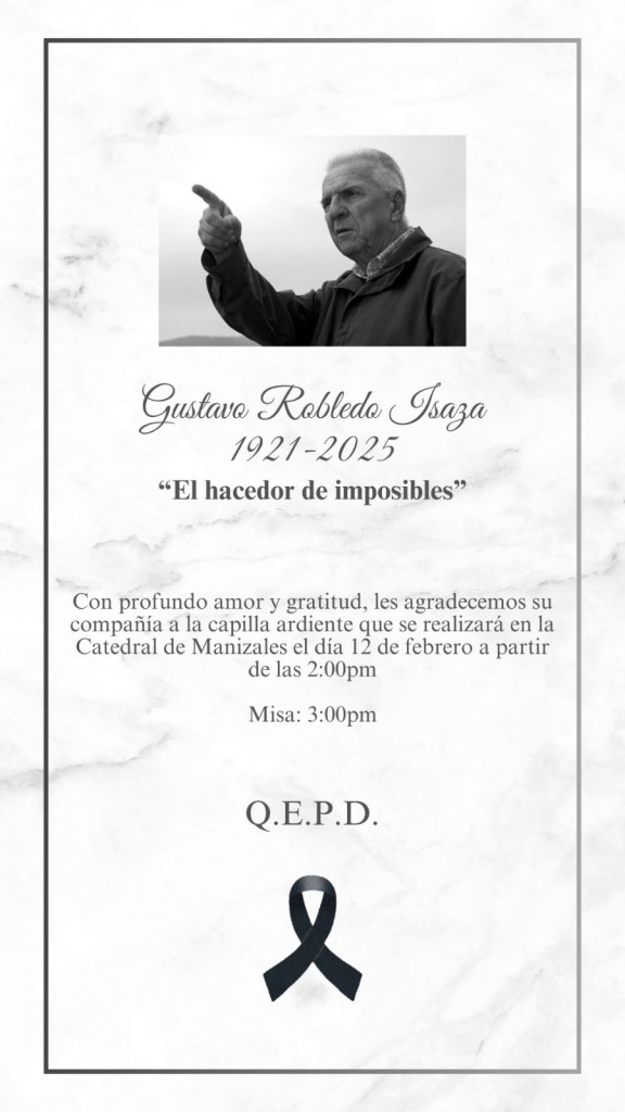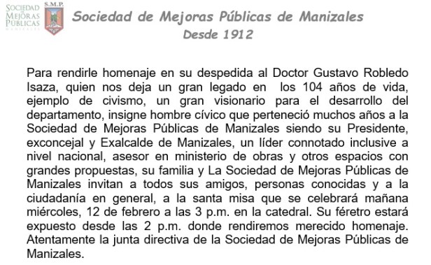 Finalmente, la Sociedad de Mejoras Públicas de Manizales y familia, invitan para el día de mañana 12 de febrero 2025, a partir de las 02:00PM, en donde estará el cuerpo de don Gustavo para dar continuidad a un acto litúrgico sobre las 03:00PM.