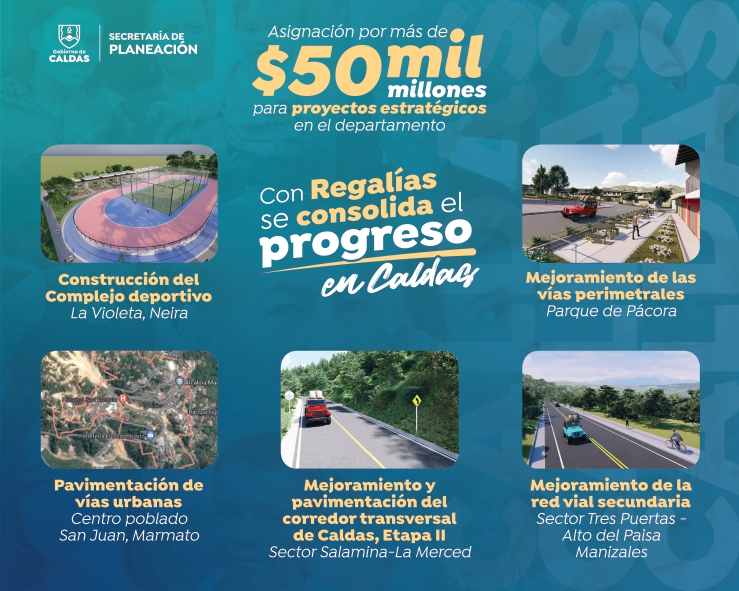 y bienestar social. 🛣 Las intervenciones se concentran en mejoramiento vial, infraestructura urbana y construcción de espacios deportivos 🏁, cinco proyectos estratégicos que beneficiarán a los municipios de Palestina, Manizales, Pácora, Salamina, La Merced, Neira y Marmato. ¡Con regalías, Caldas consolida su progreso!
