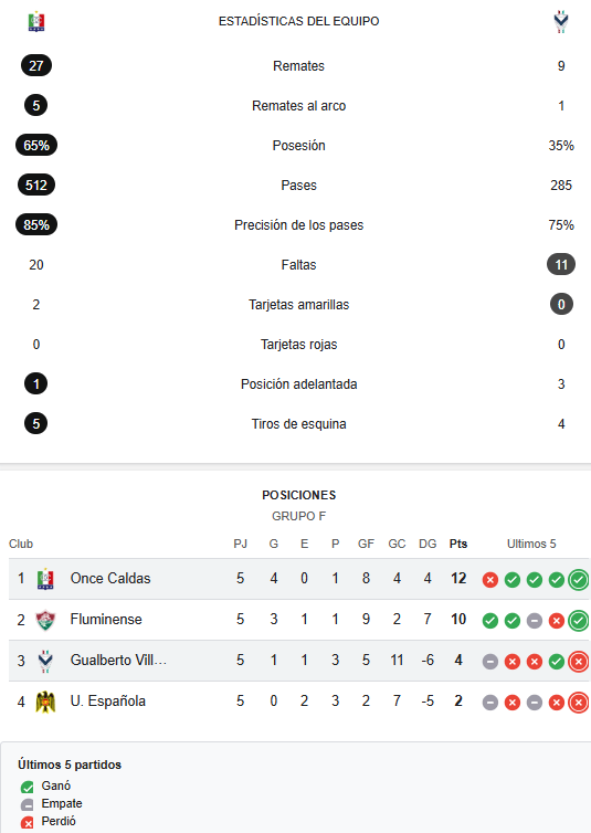 De esta manera, el Gualberto se motivó para atacar hasta los 90+5´, cuando el pitazo final, nos dejó un balance de 27 remates del local, frente a 9 del visitante, al arco 5 a 1 (en su orden) y, lo más importante, posicionar al Once Caldas como primero de la tabla en su grupo con 12 puntos de 15 posibles, seguido por el Fluminense con 10, Gualberto con 4 y de último Unión Española con 2 puntos.
