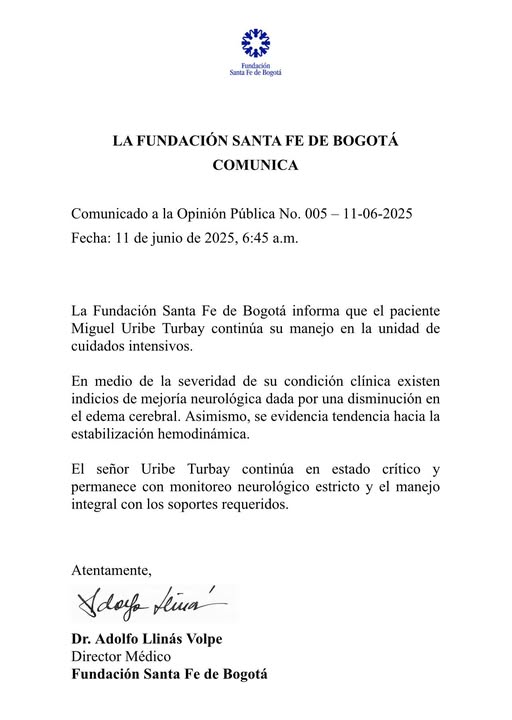 La Fundación Santa Fe de Bogotá emitió un nuevo parte médico sobre el estado de salud del senador y precandidato presidencial Miguel Uribe Turbay, tras el atentado que sufrió la tarde del sábado 7 de junio. El comunicado confirma que Uribe permanece en estado crítico, bajo atención especializada en la Unidad de Cuidados Intensivos (UCI). “En medio de la severidad de su condición clínica existen indicios de mejoría neurológica dada por una disminución en el edema cerebral», señala el informe. Familiares y simpatizantes mantienen la esperanza ante estos primeros signos positivos.