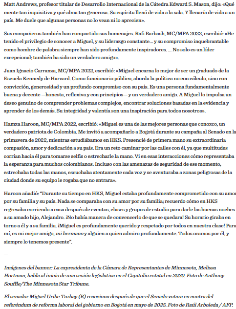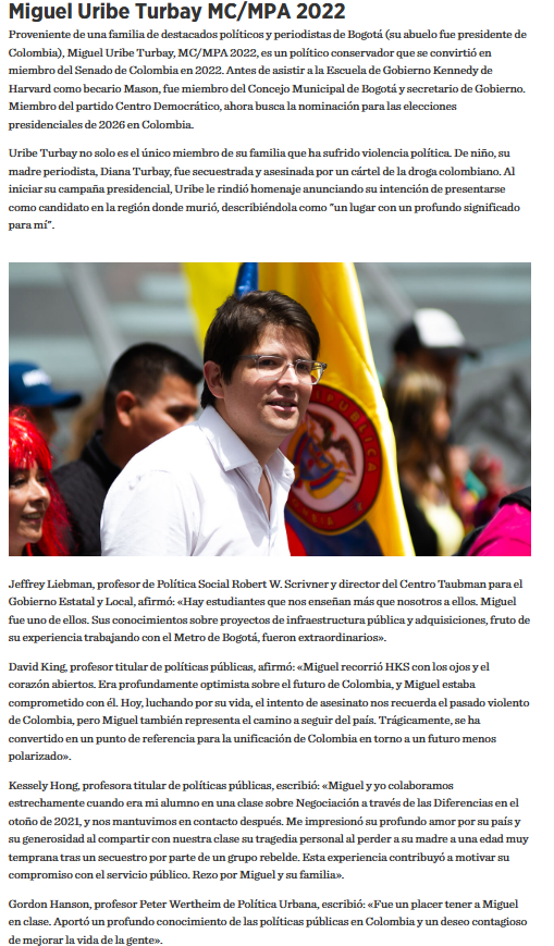 La comunidad de la Harvard Kennedy School rindió un emotivo homenaje al senador Miguel Uribe Turbay y a la congresista de Estados Unidos, Melissa Hortman, ambos exalumnos de la universidad, quienes fueron víctimas de la violencia política. En un mensaje cargado de emoción, la institución expresó: “La comunidad de HKS está profundamente entristecida y conmocionada por los tiroteos que afectaron a Melissa Hortman, MC/MPA 2018, representante del estado de Minnesota, y a Miguel Uribe Turbay, MC/MPA 2022, senador colombiano y candidato presidencial.”