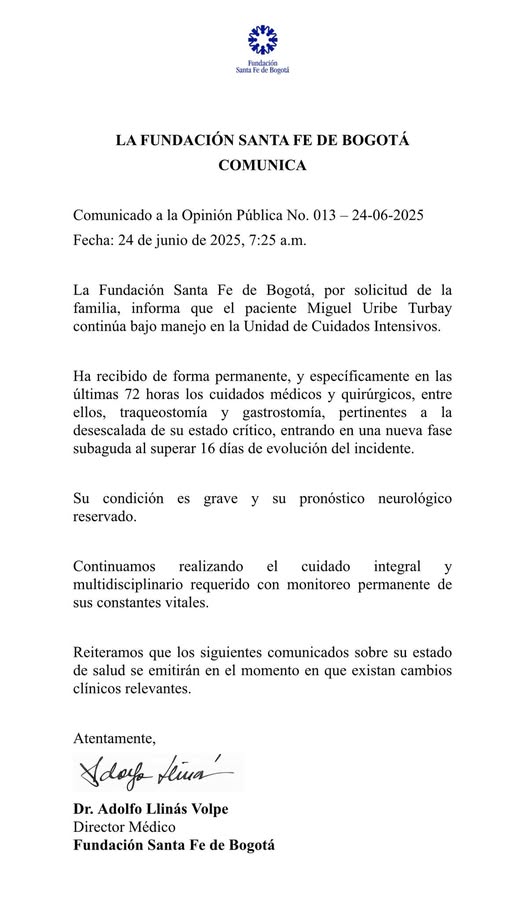 La Fundación Santa Fe emite un nuevo comunicado sobre la salud del senador indicando que: «Ha recibido de forma permanente, y específicamente en las últimas 72 horas los cuidados médicos y quirúrgicos, entre ellos, traqueostomía y gastrostomía, pertinentes a la desescalada de su estado crítico, entrando en una nueva fase subaguda al superar 16 días de evolución del incidente»