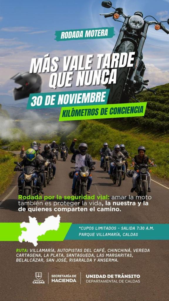 La Gobernación de Caldas invita a todos los moteros a unirse a esta experiencia que busca más que conectar destinos: conectar vidas, crear conciencia y rodar con responsabilidad.