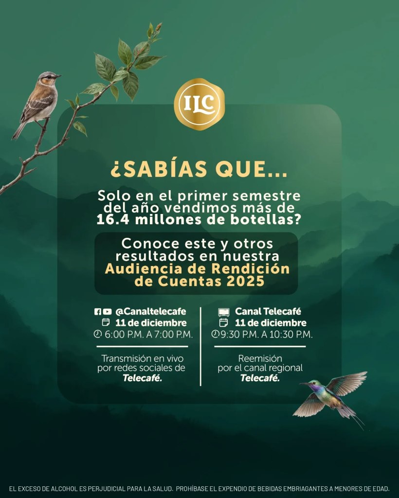 Conéctate a la Audiencia de Rendición de Cuentas 2025 de la Industria Licorera de Caldas y conoce por qué están haciendo historia en el sector de licores en Colombia. La emisión será por las redes sociales del Canal Telecafé el 11 de diciembre de 6:00 pm a 7:00 pm, la reemisión por el Canal Telecafé de 9:30 pm a 10:30 pm.