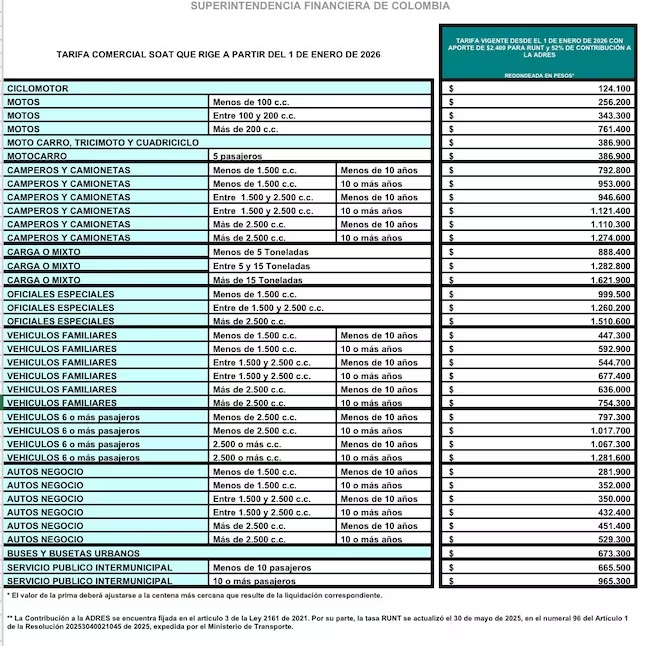 El inicio de 2026 trae consigo cambios en el costo del Seguro Obligatorio de Accidentes de Tránsito (SOAT). La Superintendencia Financiera de Colombia oficializó las tarifas que regirán desde el 1 de enero, con un aumento diferenciado según el tipo de vehículo.