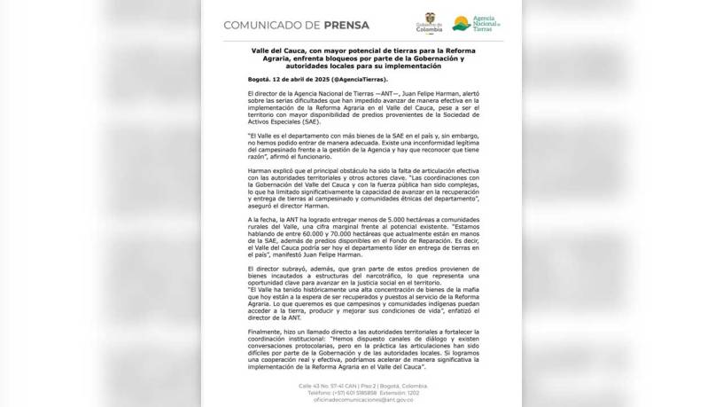 El director de la Agencia Nacional de Tierras, (ANT) Juan Felipe Harman, el comunicado público alertó sobre las dificultades que impiden avanzar de manera efectiva en la implementación de la Reforma Agraria en el Valle del Cauca, pese a ser el territorio con mayor disponibilidad de predios por parte de la Sociedad de Activos Especiales. (SAE)